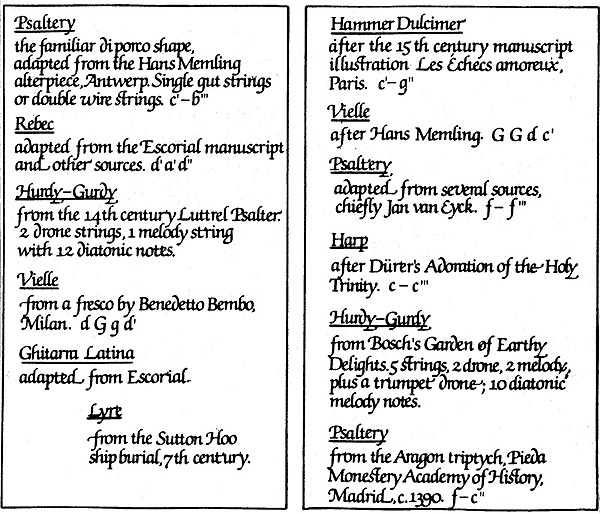 Here is a listing of the instruments that Ben built. He brought his engineering genius to each of them with the result that they were low-maintenance, played well and sounded wonderful. And always with a nod to authenticity. He respected the building methods of the old luthiers and never did anything that would dramatically alter the sound or playability of the instruments. He took the techniques of old and mastered them. ![]() |