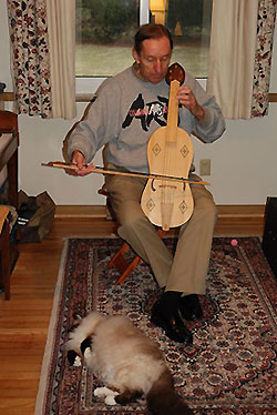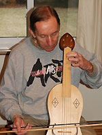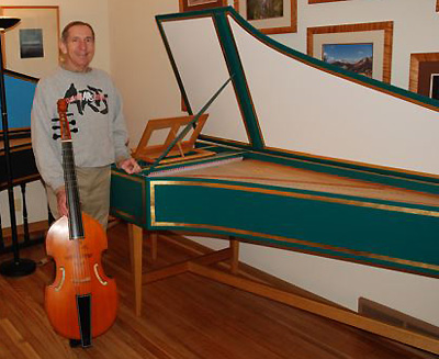 ![]() ![]() Ben also designed and built built a variety of early bowed stringed instruments, including the vielle shown here. He also made bows, copying historical bows found in museums. His cat, buddy, was relieved to learn that the "catgut" strings are not actually made from cats. But he was eventually most famous for his harpsichords. His innovations and improvements, while based closely on historical models, make his instruments more dependable and easier to maintain than most modern harpsichords. He built his own device for turning twisted harpsichord legs, using a router setup. His feats of engineering always amazed me! |