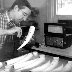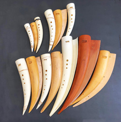 ![]() ![]() ![]() ![]() Ben designed and built a line of gemshorns, (soprano, alto, tenor, and bass) that were made from resin rather than cow's horn. The molds were all hand crafted from maple and cherry. The idea was that a resin instrument would overcome the tendency of natural horn to shrink and expand and become unplayable after a short time. They were each individually tuned to a Peterson strobe and finished with the sign of the Unicorn. These proved to be quite popular and are still in demand, although no longer made. They now fetch incredibly high prices on ebay. |