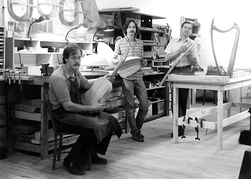 ![]() The Lute & Guitar Shop—The early years. Ben Bechtel joined Larry Brown and Dave Schneider in the Lute & Guitar Shop in 1987 on Brotherton Road in Oakley, a suburb of Cincinnati. (Larry had started the shop in 1977 on Madison Road in O'Bryonville and built instruments there for five years, before he outgrew the space.) The three luthiers shared the space, the rent, and instrument-making knowledge. Shown in the photo are Larry in the foreground, Dave with a lute body, and Ben working on a harp. |